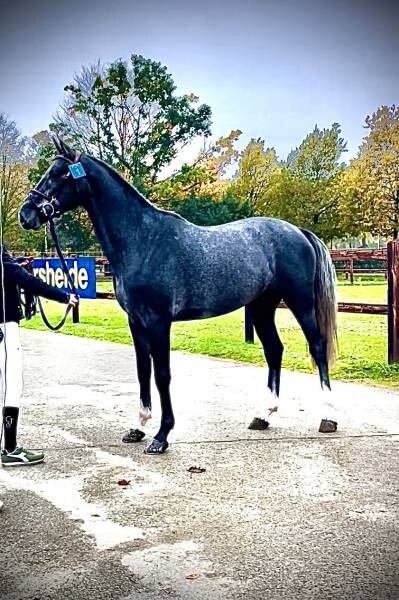 The lovely 3y old grey stallion "Top Secret van't Meulenhof" by Leandro VG x Carthago approved for Zangersheide Studbook.
